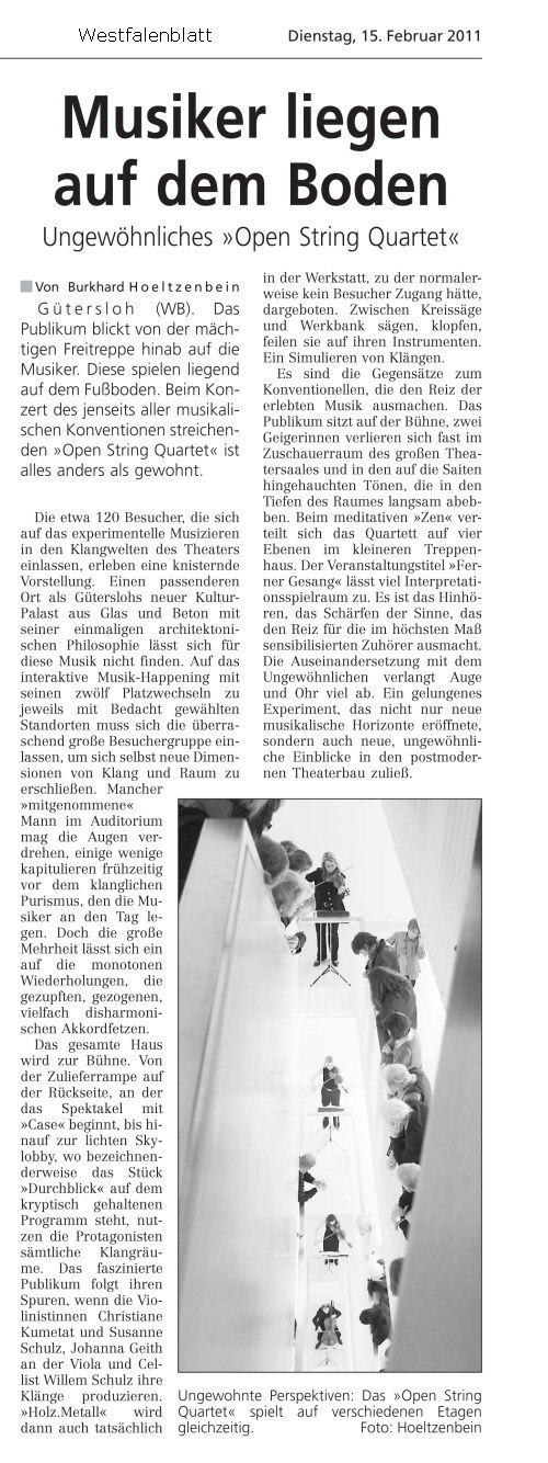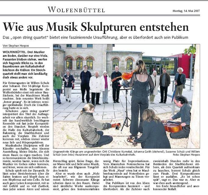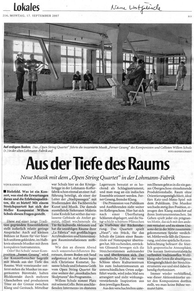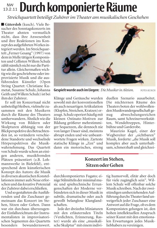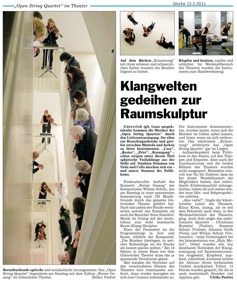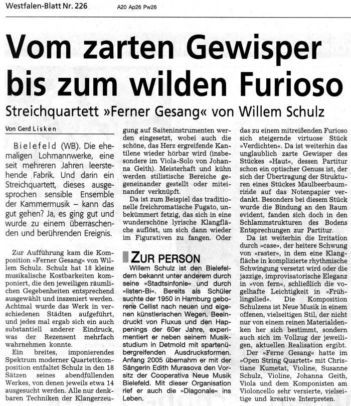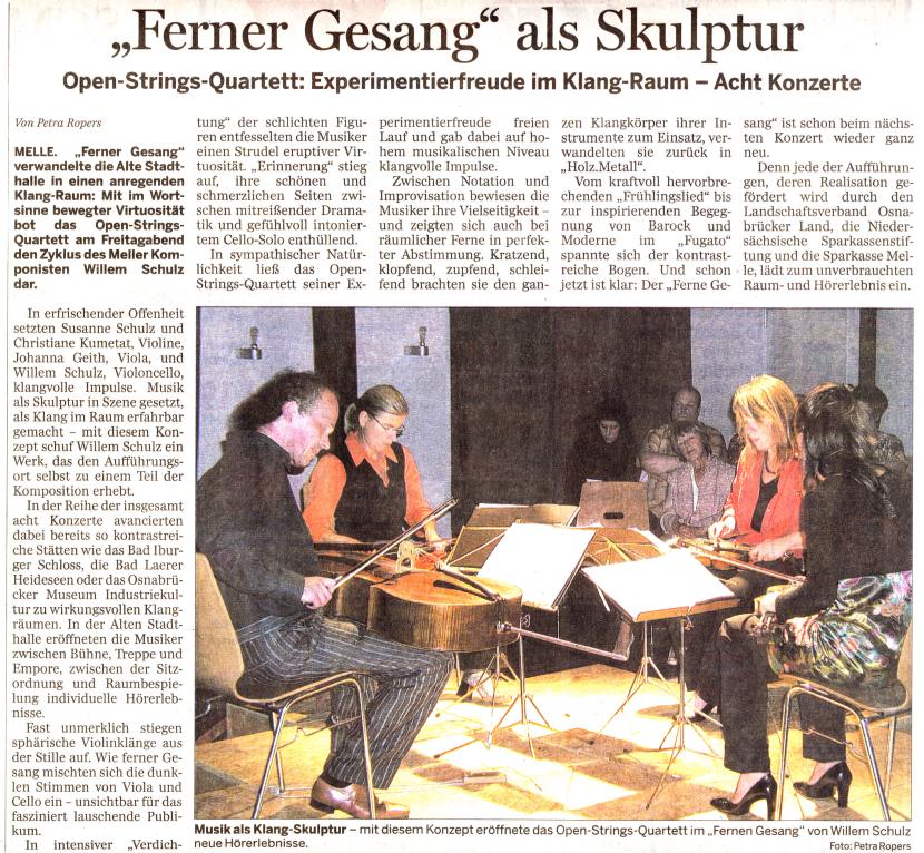 Ferner Gesang nennt der durch zahlreiche ungewöhnliche Stadtsinfonien bekannte Meller Komponist Willem Schulz seinen neuen Zyklus für Streichquartett, der aus 18 Sätzen besteht. Die Instrumente werden dabei sehr vielseitig bespielt: archaisch als Werkstücke aus Holz und Metall, dann wieder traditionell in der Art des klassischen Streichquartetts bis hin zu experimenteller Performance. Die Stücke, die jeweils eine Länge von 3 bis 10 Minuten haben, greifen facettenreich Themen der täglichen Wahrnehmung auf und spiegeln das genreübergreifende musikalische Spektrum des Komponisten. Titel sind beispielsweise "weit", "durchblick", "verdichten", "zrirr" oder "holz.metall." und durchgängig stellt sich dabei die Frage nach dem "fernen gesang", der ja zunächst einmal in einem Streichquartett garnicht enthalten ist.